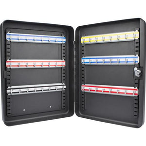 Barska has designed the CB12484 48 Keys Adjustable Key Lock Box with Key Lock to store up to 48 keys. You can organize them with the 48 colored key tags and colored labeled key shelves. The outside is protected by a key lock and 2 keys are provided. Barska has provided 4 anchor holes in the back of the key lock box and mounting hardware to secure to a solid surface. The outside is painted with a durable and attractive black finish.