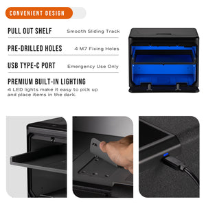 Inside, the RP2009 boasts a generous 0.92 cubic feet of storage space with interior dimensions of 9.06" H x 14.17" W x 12.40" D—easily fitting A4 documents, large handguns, and more. A pull-out sliding shelf offers layered organization and is fully removable to accommodate bulkier items. Four interior LED lights activate automatically when the safe is electronically unlocked, and a built-in LCD panel provides real-time information on internal temperature, humidity, lock status, and battery levels. A USB Type-C port provides emergency power access, so you’re never locked out.