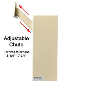 • The chute is adjustable for walls between 3-1/4" - 7-3/4" thick. Chute is two pieces. One-piece slides into the other.