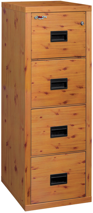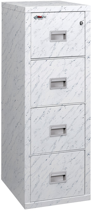 The FireKing 4R1822-C Premium Designer Four Drawer Turtle Vertical Fire File Cabinet is a compact 22” size depth and is available in a four-drawer vertical model. It also features a U.L. one-hour fire protection as well as impact resistance. The handles are recessed and come with a standard 4-pin lock for additional protection. You can choose one of the four designer finishes marble, pine, chestnut, or walnut.
