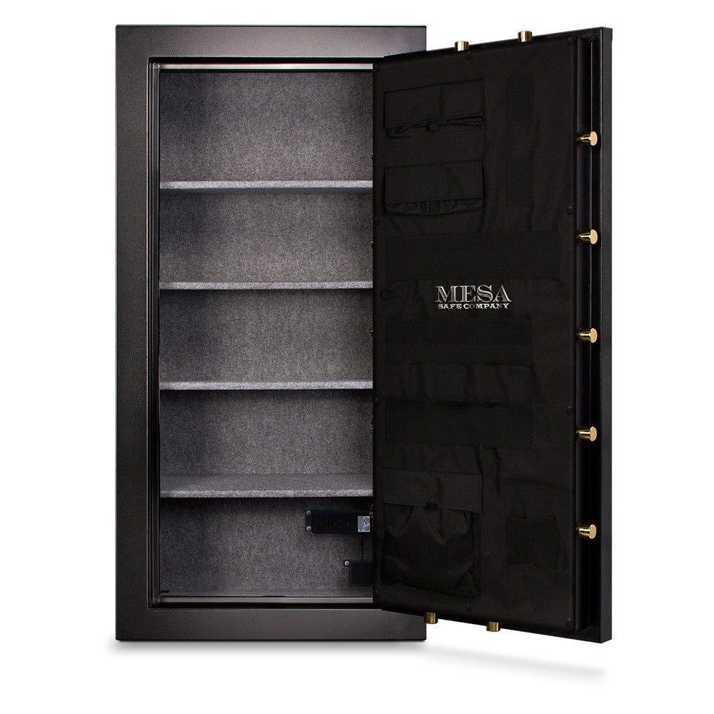 The features of the Mesa MBF7236E gun and rifle safe include a 42 gun capacity along with a one hour rated fire safe tested at 1750 degrees - interior temperature did not exceed 350 degrees F and a dual layer firewall interior. The door is 7 gauge, with an additional 11 gauge steel plate covering the lock and handle area. The body of this all steel safe is 12 gauge and the interior outlet stip includes 3 Electrical Sockets & 2 USB Ports. The massive 1-1/2" diameter solid steel live locking bolts add burglar protection and make it difficult to pry the door open. Power source cord included. There are four recessed anchor bolt holes used to securely anchor the safe. (anchors not included). The interior shelves, walls and door panel are fully upholstered and it includes high strength adjustable and removable shelves. Pocket door organizer installed at no additional charge. This safe comes in a choice of a dial or an electronic lock.