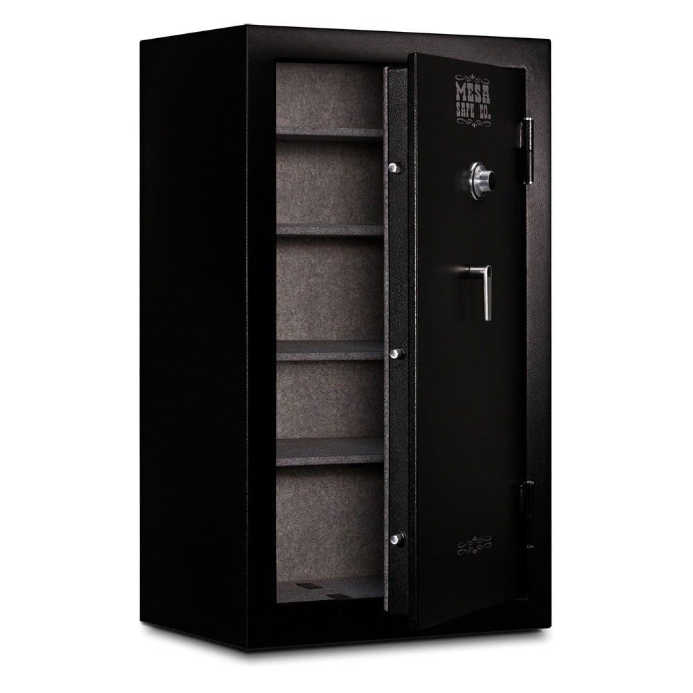 The Mesa MGL36C Gun & Rifle Safe is made of all steel and has 12 gauge steel in the body and the door. There are also six (6) 3/4" diameter chrome plated locking bolts to prevent pry attacks on the door. Along with that is heavy-duty solid steel hinges. The lock and handle are protected by an additional layer of 1/8" steel to prevent drill attacks on the door and lock. It also features a 30 minute fire rating, tested at temperatures up to 1200 degrees F on the outside. There is also a heat activated seal around the door. Mesa Safe also performed a factory test where they dropped the safe 2 stories. This means that if your safe falls two stories into a basement during a fire, the door does not pop open introducing your contents to the heat.