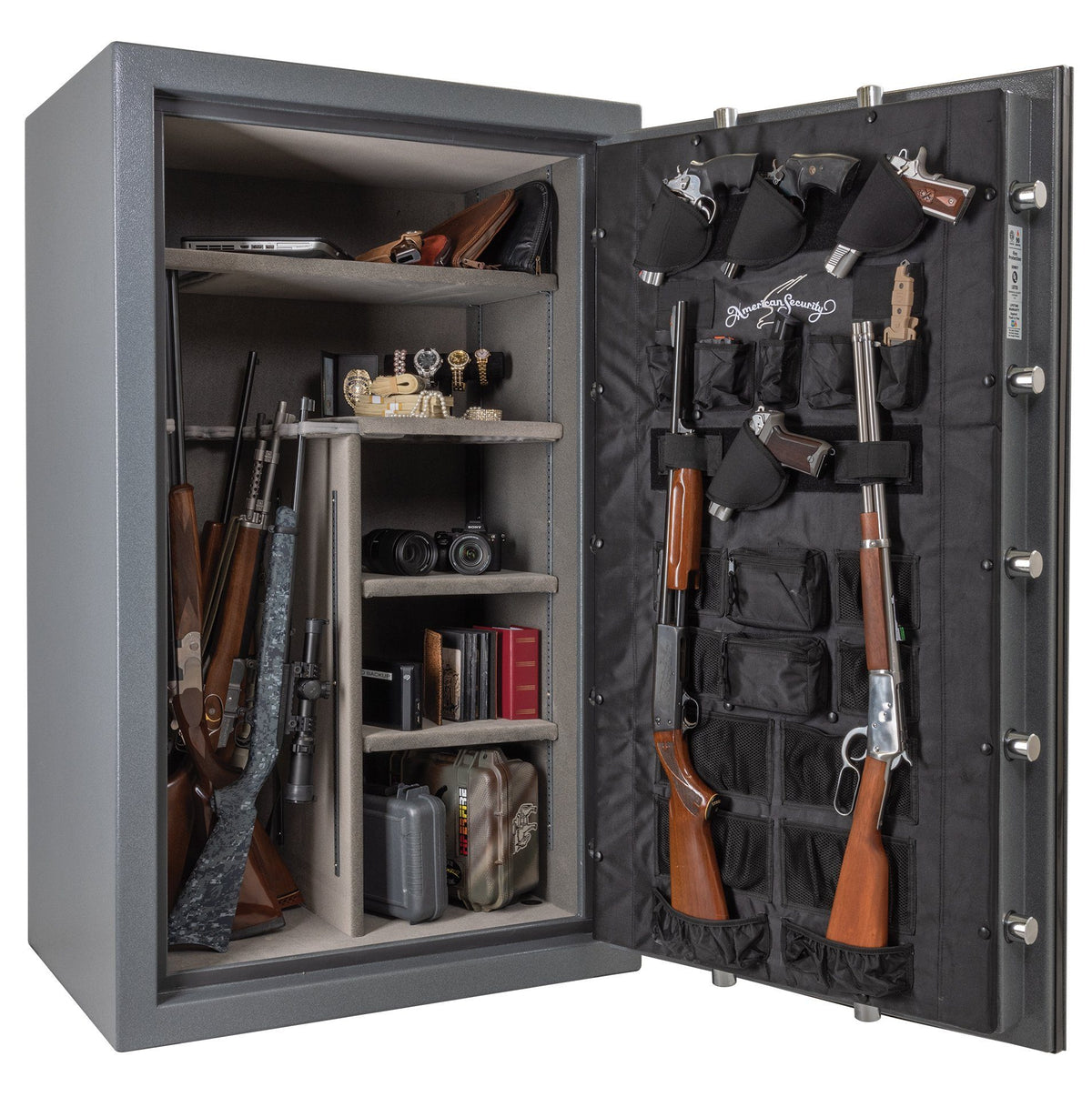 The AMSEC fire and theft-rated NF6036E1 gun safe features fully adjustable interior shelves that are all upholstered in an all-velour plush gray fabric (standard feature), and the back panel features a Premium Door Organizer (PDO) for additional storage and organization. The outside of the door boasts a 5-point handle in black nickel.