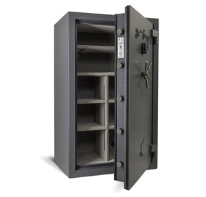 The outer layer of 11 gauge steel in the body on AMSEC fire and theft-rated NF6036E1 Gun Safe encloses three layers of fire-insulating material along with a 1/4" steel plate door for a barrier from attacks and fire. Because of this manner of construction and the fact that it is equipped with a UL Listed Type 1 ESL10 Digital Electronic Lock and protected by a massive hard plate means the safe has been awarded the U.L. Residential Security Container (RSC) burglary classification. This is your assurance of quality and protection. In addition, there are also nine massive 1-1/2" thick locking bolts and five deadbolts to provide superior door security. (for a total of 14 bolts)