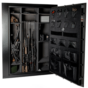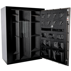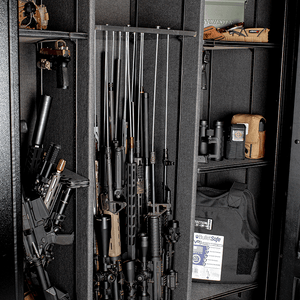 The outside is painted with a durable powder-coated textured slate door with a black body. A 5-spoke black, chrome vault handle is standard. Inside is a Power Docking System that provides (2) 110V outlets and (2) USB ports to plug in items such as a light kit, dehumidifier rod, or other accessories. An adjustable shelving system gives you easy access to your rifles.