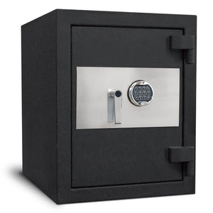 The door is locked on the Stealth CS25 Concrete Composite Burglar Fire Safe with 6 solid steel chrome plated 1-1/4" locking bolts. Three of them are active and three are deadbolts on the hinge side. This makes the door difficult to pry open. The door is also secured by a UL Type 1 high security NL digital electronic lock which is one of the most reliable locks in the industry today. The lock is backed by Stealth's 2-year factory warranty. Stealth includes an internal hardplate and relocker behind that lock that adds an extra level of security to prevent drill attempts to the door.