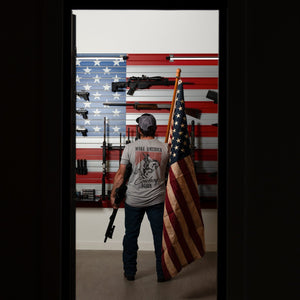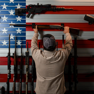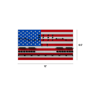 The Hold Up Displays HD116-F Patriot Wall Display Package is the ultimate wall-mounted storage and display system for firearm enthusiasts who want maximum capacity with bold, American-made style. Designed around a striking stars-and-stripes layout, this massive 6.5-foot-tall by 12-foot-wide wall system securely stores up to 27 long guns, 12 handguns, plus magazines, ammunition, and gear, all in one organized, easy-to-access display.