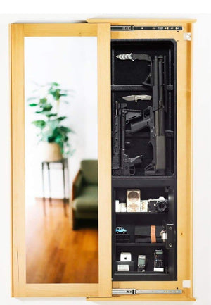 CLICK HERE to watch our video on “What to Do When Your Safe Arrives.”Are you worried about someone breaking into your home and finding your weapons? Why not hide them in plain sight? Tactical Walls 1450M acts as a full-length mirror but provides two hidden compartments to store your rifles and pistols. The smaller compartment for your pistols is 10.00" H x 14.00" W x 3.50" D. The larger of the two compartments will hold your rifles and is 40.00" H x 14.00" W x 3.50" D. This concealment mirror fits between 16" on the center studs.