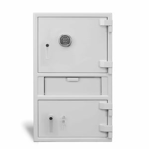 A convenient front-loading drop mechanism in the middle of the safe allows for seamless depositing into a designated compartment. A dual-key bank deposit lock secures this compartment. One key is provided exclusively to the manager on duty, ensuring that only trusted personnel can access the deposits. The other key is given to an armored car service that picks up the deposits, so both keys are required to open the safe door.