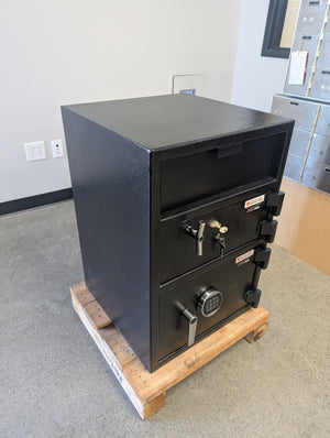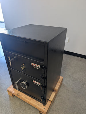 The top compartment has a dual key bank deposit lock for dual control. This means a manager has one key, and an employee has another. Both keys are required to open the door to access the deposits.