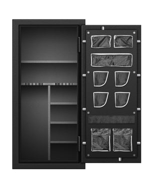 The SafeandVaultStore GS592820 Second Amendment features two layers of 12 gauge steel back to back in the door (0.2188" thick) and a 12 gauge steel body. Additional security includes six active live locking bolts, along with four deadbolts to prevent door removal during a forced entry attempt. The locking mechanism is protected by a heavy duty, drill resistant hard plate and an internal re-locking device provides an additional defense against a break-in. The GS592820 Gun Safe also has bolt down holes to securely anchor the safe to the floor. This safe features a Basic Digital Electronic Lock.