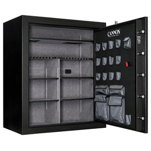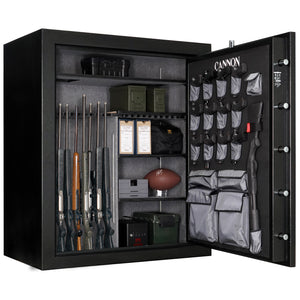 CLICK HERE to watch our video on “What to Do When Your Safe Arrives.”The Cannon FD5950-H22FBC-23-DS Fortified Series 80 Gun Safe offers superior protection for your firearms and valuables, combining fire, water, and theft resistance in one secure package. With a 75-minute fire rating at 1400° F and the ability to withstand 2 feet of standing water for up to 14 days, this safe ensures your collection remains protected even in extreme conditions. The 14-gauge steel door and body, reinforced by a hardened steel anti-drill plate, provide a solid defense against break-in attempts, while seven 1.25-inch solid steel locking bolts add an extra layer of security. For quick and easy access, the electronic lock with an easy-access keypad allows secure entry, with a backup key available for emergencies.