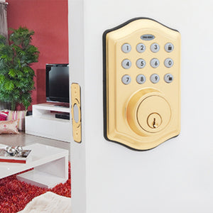 The Honeywell 8712009 Electronic Deadbolt Door Lock comes in a polished brass finish. There are 3 other finishes available as well in this same style. This deadbolt will suit a range of different doors and home decor. It will work with 1-3/8" to 1-3/4" door thicknesses with an adjustable latch that fits 2-3/8" or 2-3/4" backsets.