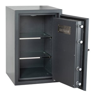 CLICK HERE to watch our video on “What to Do When Your Safe Arrives.”NEW for 2015, the Hayman MVEX-3516 MagnaVault has been redesigned and loaded with some great features. It is a burglar and fire rated safe that is perfect for both residential and commercial applications. The fire rating on this safe is better than most and features a 105 minute fire rating, tested at 1275 degrees F. The inside temperature never exceeded 350 degrees F.