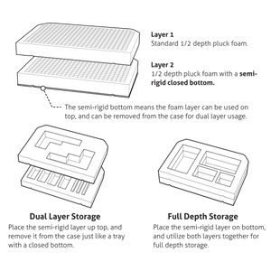 • Each foam layer is 1/2" in depth of the case, so they are stackable, and one foam layer incorporates a semi-rigid bottom.