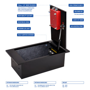 The safe interior is fully carpeted on all sides, offering a soft and protective environment for your valuable items. The lid is additionally covered with foam, providing extra cushioning and preventing any potential damage to your items. Experience quick and smooth access to your belongings with the hydraulic lift mechanism. Opening the door is a breeze, enabling you to retrieve or store your items conveniently and effortlessly.
