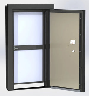 If you are inside the Hamilton UL-M Milford Series Vault Door and it is locked, an emergency release mechanism allows you to get out. You can also order the door in a right hand swing (hinges on the right hand side as you are looking from the outside of the door) or a left hand swing (hinges on the left hand side as you are looking from the outside of the door. A daygate is optional and allows you to keep the door open while keeping the room locked during the day.