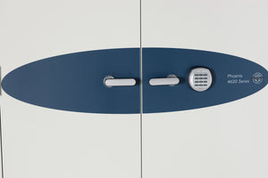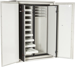 The heavy duty construction of the Phoenix 4623 Data Commander 2 Hour Data Media Safe protects your contents from magnetic interference. The digital lock on the door can easily be programmed with your own personal combination. This data media safe comes with the Phoenix lifetime after-a-fire replacement warranty, as well as a full, two-year materials and labor warranty. This safe comes standard with 10 drawers and 4 shelves for large volume storage of your media and documents.