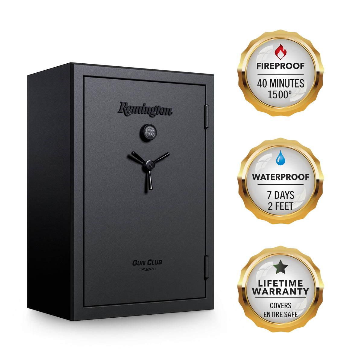 Internally carpeted to shield firearms from scratches, the quilted door panel houses eight handgun holsters. Finished in a striking Dark Gray Metallic Hammertone with a stylish electrophoresis black gloss 3-spoke handle with durable metal construction, the safe is backed by Remington's best-in-class lifetime warranty covering theft, fire, natural flood, locks, parts, and paint.