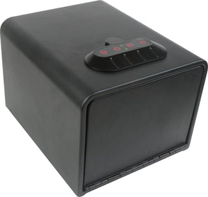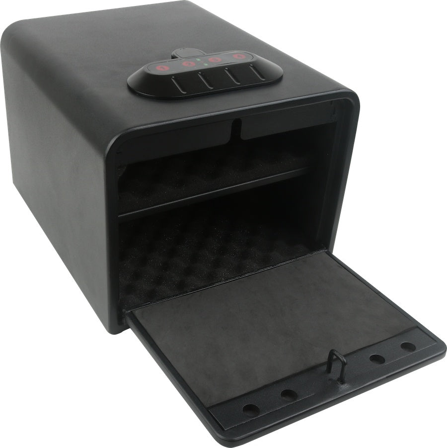 The outside is protected by a fully programmable 4 digit electronic lock. You can select your own custom combination from 3-8 digit codes. The touch pad is backlit illuminated in red for easy access in the dark. The buttons do make a sound when pressed but can be muted if you so choose. There is also a tamper indicator which will alert you in case someone tries to break into the handgun vault. There are 2 override keys provided in case the batteries die or something happens to the lock.