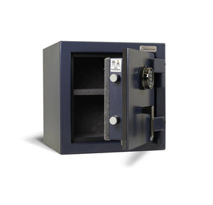 The AMSEC AM2020E5 45-minute fire-rated security safe is one of three models that conveniently protect your important documents, cash, and other valuables at home. The AMSEC Home Security series offers an unbeatable value, featuring a deep blue textured finish with black nickel hardware and gray fabric interior, including back-cover and firewalls.