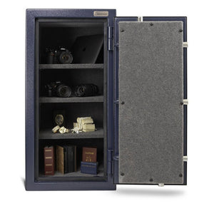 Along with the blue textured finish, the AMSEC Model AM4020E5 home security safe has external hinges that provide complete access to the interior and allow the door to be opened a full 180 degrees. There is an "L" shaped handle on the door. These features compliment any trophy room or den, providing a handsome look.