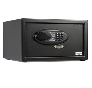 The AMSEC Electronic Hotel & Residential Safe has heavy duty steel construction, that, when bolted securely down, offers excellent burglary protection. A convenient motorized locking system, incorporating the latest technology, is activated by a 4 digit combination, standard hotel room configuration (customer sets new combination every time safe is used, quickly and easily). The same combination can be used continually just as a standard electronic safe, if only one person is accessing the safe.