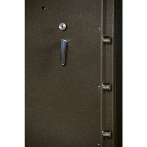 The AMSEC VD8042BFQ Vault Door, in addition to its strong bolt work, has insulation material in the door that resists the extreme heat of a fire. The insulation material is sandwiched between one inner 1/8" steel plate and a 1/4" outer steel plate to add security to the vault door.