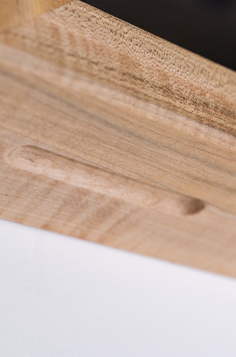 It is made from solid wood – maple, oak, or walnut stock finishes, either stained or painted black or white.