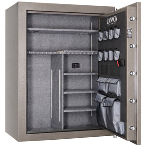 CLICK HERE to watch our video on “What to Do When Your Safe Arrives.”The Cannon FD5945-H12FEB-23-DS Fortified Series 72 Gun Safe offers superior protection for your firearms and valuables, combining fire, water, and theft resistance in one secure package. With a 75-minute fire rating at 1400° F and the ability to withstand 2 feet of standing water for up to 14 days, this safe ensures your collection remains protected even in extreme conditions. The 14-gauge steel door and body, reinforced by a hardened steel anti-drill plate, provide a solid defense against break-in attempts, while seven 1.25-inch solid steel locking bolts add an extra layer of security. For quick and easy access, the electronic lock with an easy-access keypad allows secure entry, with a backup key available for emergencies.