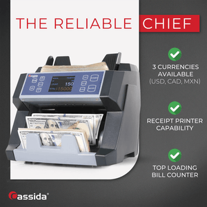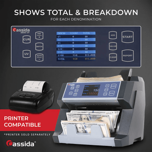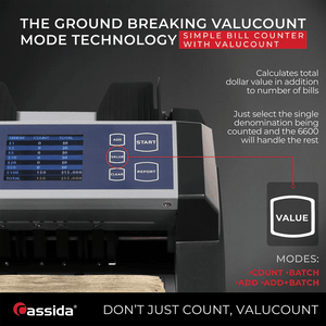 The Cassida 6600 UV/MG Business Grade Bill Counter with ValuCount is the ultimate cash handling solution for businesses that demand speed, accuracy, and reliability. This advanced bill counter features remarkable counting speed of up to 1,400 bills per minute, ensuring efficient and accurate cash processing. Equipped with ultraviolet (UV) sensors and magnetic ink detection (MG), the Cassida 6600 offers robust counterfeit detection, automatically stopping and alerting you if a suspect bill is detected. The innovative mechanism design combines the convenience of a top-load counter with the smooth operation of a backloading counter, ensuring a hassle-free counting experience.