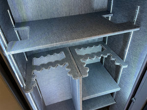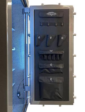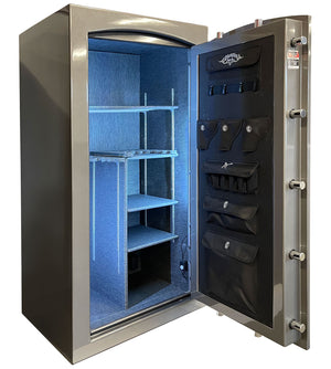Inside, the TY-25 is built for practical everyday use. High-capacity gun racks organize your long guns efficiently, while a steel-reinforced top shelf gives you solid storage for handguns, accessories, and valuables. Motion sensor LED lighting illuminates the interior the moment you open the door, and a 120-volt power outlet keeps electronics and accessories powered inside the safe. A deluxe door organizer maximizes door space for documents, smaller items, and everyday carry gear. The plush black velour interior keeps everything protected and scratch-free, and the full 180-degree door opening gives you unobstructed access to everything inside.
