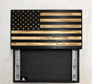 If you want to have your pistol at the ready in case of an emergency but also want it to remain hidden, why not also have a nice piece of art to hang on the wall. The American Flag Gun Box is a fully carved piece of art depicting the beautiful Stars and Stripes. Your weapon will be hidden in the concealment compartment that is easily accessible by sliding the flag upward. The flag mounts securely to the wall and shows no signs of its hidden compartment.