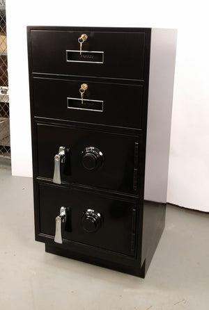 CLICK HERE to watch our video on “What to Do When Your Safe Arrives.”Cash handling is important to any business, especially financial institutions with cash. The Fenco 207 Pedestal Unit with 2 Locking Box Drawers and 2 Steel Plate Lockers is 38.50" tall and 18.00" wide. Both lockers have 1/4" steel behind a 1/2" steel plate doors (B-Rate Burglar Rating), equipped with three-point locking bolt-work, Group 2 Spyproof Mechanical Combination Locks, and Key Locking L-Shaped Handles. Fenco's Goldine 200 Series offers versatility for your teller line, teller pod, back counter, or work room. The top drawers are locked by a key lock.
