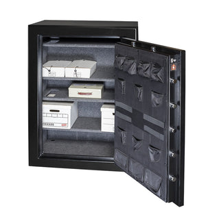 The Gardall BGF-6040 will hold up to 39 rifles without scopes. It also features a NEW Premium Quality Door Organizer on the door as a standard feature. This redesigned full-length door organizer offers extra capacity for ammo and pistols. There is a 5 spoke handle to open the door available in gold or silver trim package. Other security features include 9 active 1-1/2" bolts to prevent pry attacks as well as 3 - 1-1/2" deadbolts on the hinge side. There are 4 anchor holes on the bottom to bolt to a sold surface (highly recommended). The outside of the BGF-6040 is painted with a heavy-duty black powder-coated (matte paint).