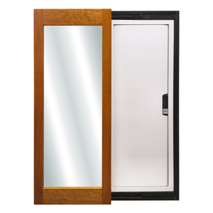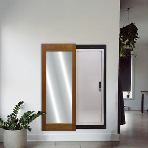Enhance your home security without compromising on style with this full-length sliding mirror concealment system, custom-designed to fit over the SnapSafe Tall Wall Safe. The mirror glides smoothly on premium ball-bearing slides, revealing a wall safe behind it. It's perfect for keeping firearms, documents, or valuables hidden in plain sight. The hidden latch mechanism adds an extra layer of discretion, cleverly positioned behind the top edge of the mirror for quick access without visible hardware.