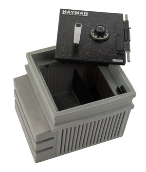 Hayman Safe Company will, at their option, replace or repair any of the polymer-body floor safes equipped with a slide bolt mechanism or better that are successfully burglarized. All polymer-body safes damaged by fire or seepage through the body will, at Hayman's option, be repaired or replaced. Improper installation can nullify this guarantee.