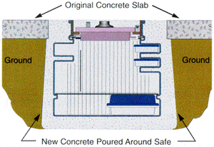Order your safe with the Water Resistive Seal for new construction installations. Dig out the ground to provide a form for cement floor installation, put the safe in live concrete in the hole, and adjust the safe to floor level. When the safe is locked securely by the setting up cement, fill the remaining hole and finish the slab pour.