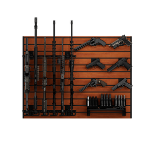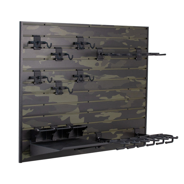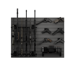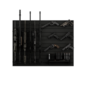 The black camo slatwall panels serve as the foundation, allowing you to position all racks and accessories exactly as you want. Whether you're building a tactical display, a safe-room wall, or an organized armory, the system is fully customizable and expandable over time. All hangers feature a durable black powder-coat finish for a clean, uniform look and long-lasting protection.