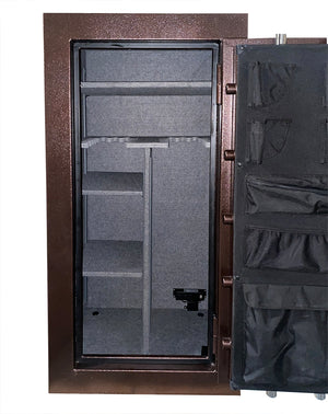 Inside the Hollon The Dominion 22 Gun Safe is a gray interior for easy visibility. A pocket door organizer is also standard for the organization of your pistols and other items.