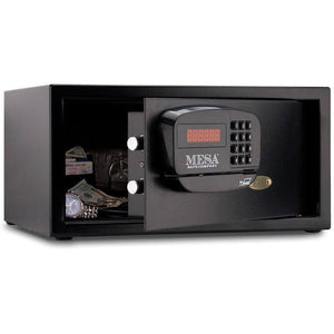 The Mesa MHRC916E Hotel Safe is designed to offer security and user-friendly functionality, making it the ideal choice for hotels, guest rooms, or personal use. With a 1/4" thick steel door and a 1/8" high-strength all-steel body, this safe provides superior protection against tampering and theft. Its pry-resistant recessed door and concealed steel hinges further enhance its durability, making it a reliable safeguard for valuables. Inside, a spacious 1.15 cubic foot interior with a removable carpet ensures ample room to store items without worry about scratches or damage.
