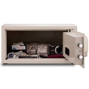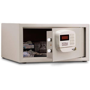 The Mesa MHRC916E comes with thoughtful details to meet a variety of needs. Weighing only 35 pounds, it features four pre-drilled anchor holes for secure mounting on a wall, floor, or optional pedestal, which elevates the safe 18" for easy access. Available in cream or black, this safe offers keyed-alike and keyed different options. Whether for hotels looking to enhance guest satisfaction or individuals looking for a dependable home safe, the Mesa MHRC916E delivers security and convenience.