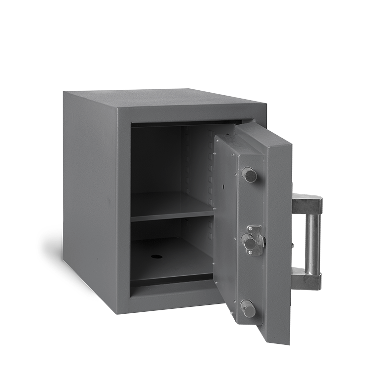 Opening and closing the safe is effortless thanks to the pull handle and three-spoke handle, designed for ergonomic functionality. The sleek grey textured finish adds a touch of sophistication, making it an attractive addition to any setting.