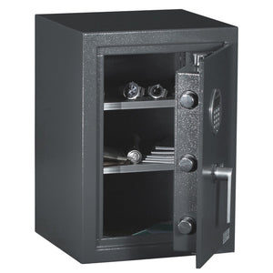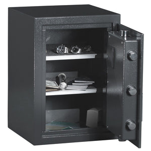 Security features on the Protex HD-53 Security Safe include; 5 active chrome plated locking bolts that are 1-1/4" in diameter. There are 4 pre-drilled anchor holes in the bottom with bolting hardware included to mount to a concrete floor. It is highly recommended that you bolt this safe down to a solid surface. The door is 2-1/2" thick with 3/8" solid steel-plate to prevent prying.