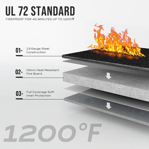 The RPNB RPFS10-B 10-Gun Fireproof Biometric Gun Safe Black features 16mm heat-resistant fireboards, offering exceptional fire resistance for your important firearms and valuables. It complies with UL 72 standards for fire resistance protection equipment, providing an impressive 40-minute protection at 1200 degrees Fahrenheit.