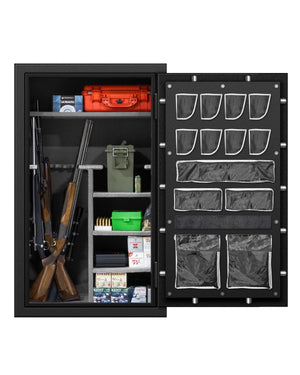 The SafeandVaultStore GS593625 Second Amendment Gun Safe will hold up to 30 long guns and rifles (without scopes) with the included gun rack package. The shelves can be moved up or down depending on your needs and can also be removed to allow more room for your guns. It also comes with eight gun holsters and five ammo/misc. Pouches.