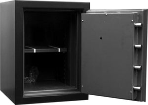 Security features include a U.L.-listed Group II key-changeable combination lock with a spring-loaded relocking device that activates in the event of an attack. Other lock options are available for an upgrade, including electronic locks, multi-user, audit trail, or high-security Group 1R locks. The lock and relockers are protected by a drill-shattering composite hard plate, while a handle-activated locking mechanism secures the door with three massive 1-1/2" solid steel bolts. Finished in a professional powder-coated blue, this 1200-pound safe is ideal for both commercial and residential environments where security is a top priority.