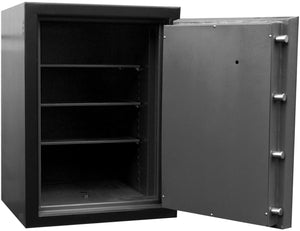 Security features include a U.L.-listed Group II key-changeable combination lock with a spring-loaded relocking device that activates in the event of an attack. Other lock options are available for an upgrade, including electronic locks, multi-user, audit trail, or high-security Group 1R locks. The lock and relockers are protected by a drill-shattering composite hard plate, while a handle-activated locking mechanism secures the door with three massive 1-1/2" solid steel bolts. Finished in a professional powder-coated blue, this 1950-pound safe is ideal for both commercial and residential environments where security is a top priority.