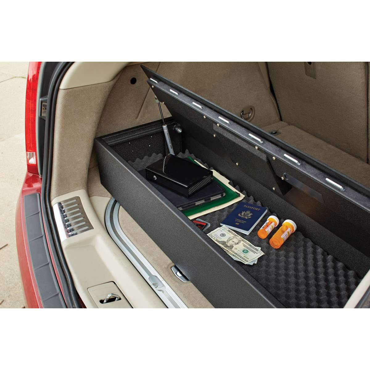 The SnapSafe 75406 Trunk Safe II is designed for theft protection for your SUV, car trunk, RV or home. It can be put under a bed or secured to a solid surface such as a bedpost or desk leg using the included 3-foot cable. This large storage space with outside dimensions of 7.00" high by 42.00" wide by 13.00" deep can be used to store tools, firearms, equipment, documents, and more.