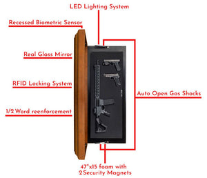 Crafted with amazing quality, this mirror is a testament to superior construction and security. Made with genuine solid wood instead of cheap pressboard, its cabinet-quality build ensures durability and reliability. The illusion of thin fame, achieved through a proprietary milling technique, cleverly disguises its true purpose, leaving observers unaware of its hidden contents. Reinforced with 1/2" wood, it deters unauthorized access by someone smashing the glass to get access to your firearms or valuables.